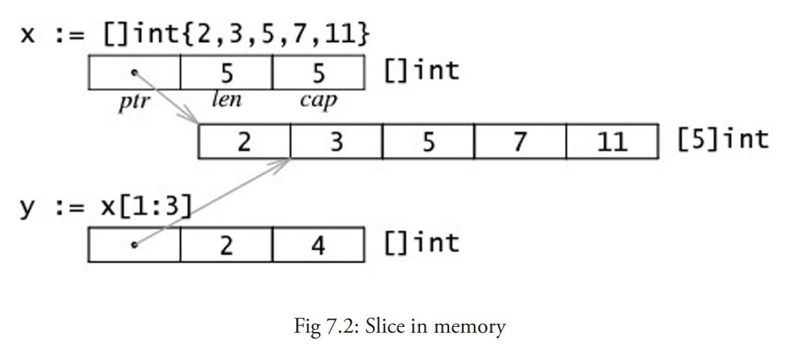 多个切片如果表示同一个数组的片段,它们可以共享数据;因此一个切片和相关数组的其他切片是共享存储的,相反,不同的数组总是代表不同的存储。数组实际上是切片的构建块。